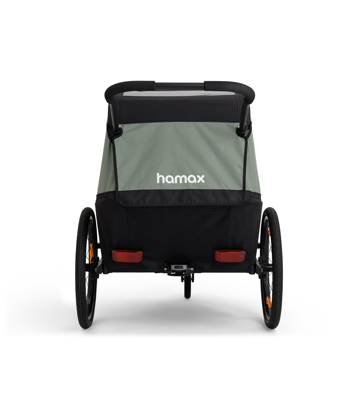 Designed for active families, the Hamax Traveller Twin in khaki-black is a stylish two-seat bike trailer that easily converts into a comfortable stroller.