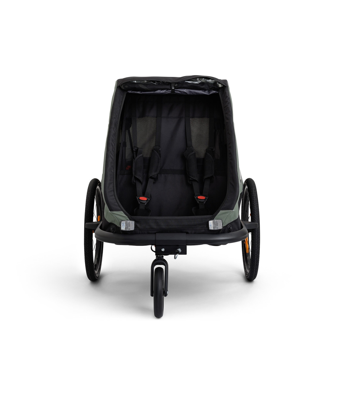 Safety comes first: 5-point harnesses keep both passengers secure, and the reliable bike attachment system ensures confident riding. Reflective details on the sides and rear improve visibility in low-light conditions.
