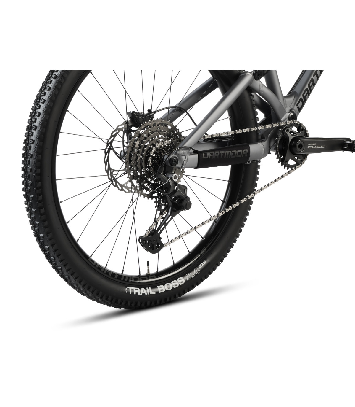 The wide, tubeless-ready Dartmoor Cruiser rims (35 mm internal width) and WTB Trail Boss 2.4” tyres provide excellent grip and comfort. The Tornado handlebar (780 mm) paired with the Viper stem gives the rider confidence and control even in the roughest terrain.