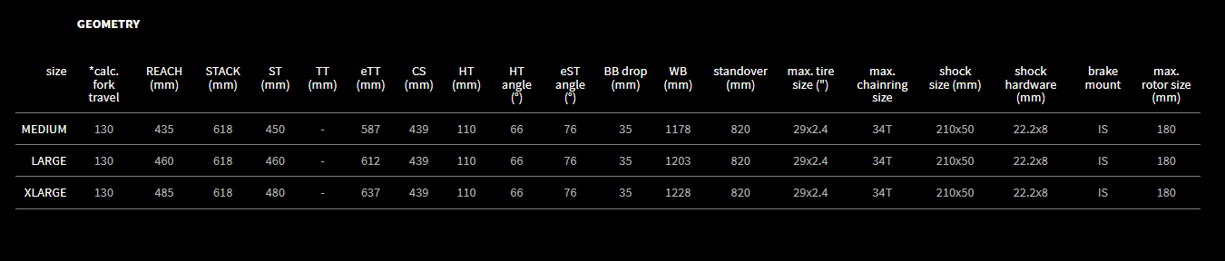 The higher placed pivot position offers high pedaling efficiency and eliminates pedal-bob when climbing. The low BB position provides high stability in difficult terrain while the 66˚ head tube angle ensures a perfect riding control no matter how steep is the track. A construction using shock extension yoke makes it possible to keep a full length seat tube allowing room for the new breed of dropper seat posts.