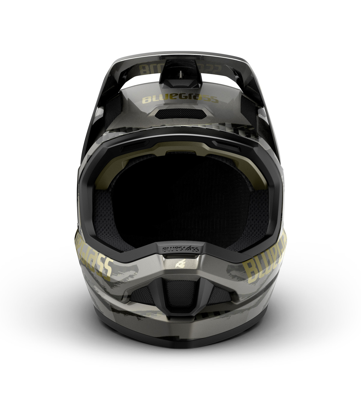 The helmet features a breakaway visor designed to release on impact and a proven Double-D buckle with soft padding for secure fastening. Finished in solar gray glossy, it combines performance-focused design with a clean, modern look. A Bluegrass helmet bag is included.