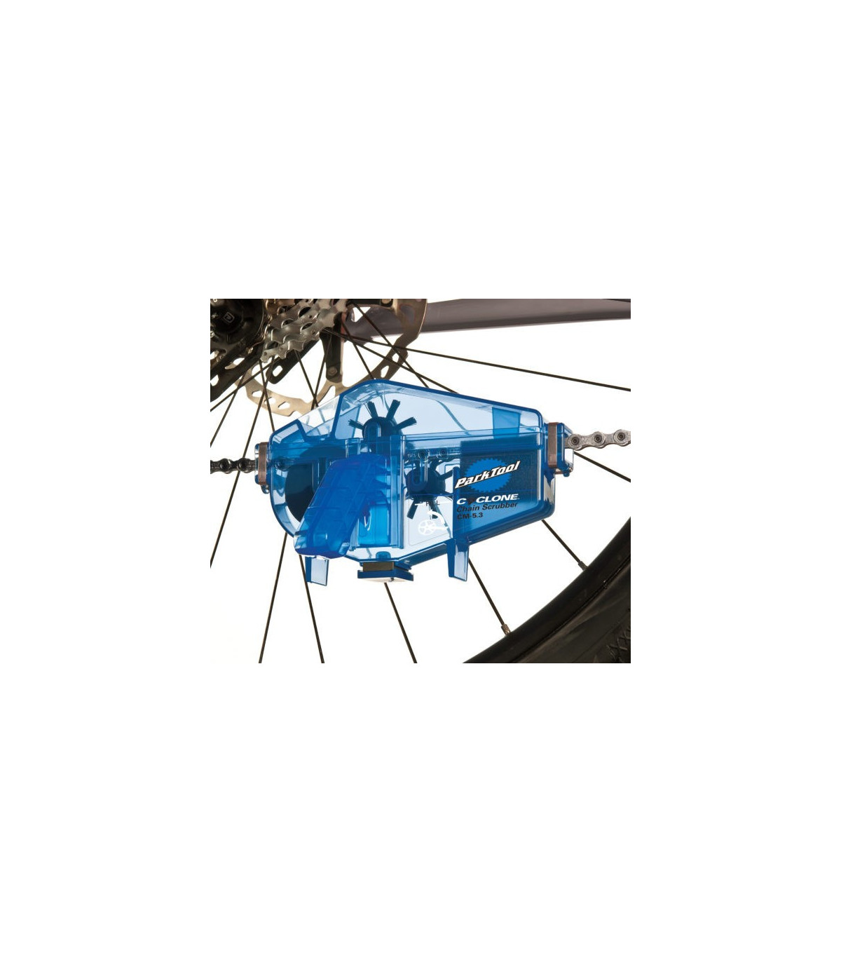 the chain from the bike. The Cyclone™ uses a large solvent reservoir, hundreds of rotating bristles,