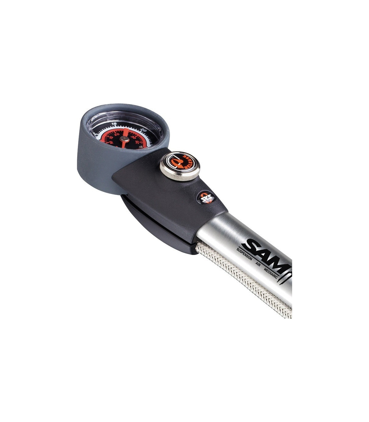 The compact SKS SAM (suspension air mechanic) suspension pump with a swivelling hose connection (reinforced with a flexible steel mesh) achieves a maximum pressure of 25 bar. The Schrader valve connection is made with a 2-stage threaded connector, making it possible to screw off without any loss of pressure.