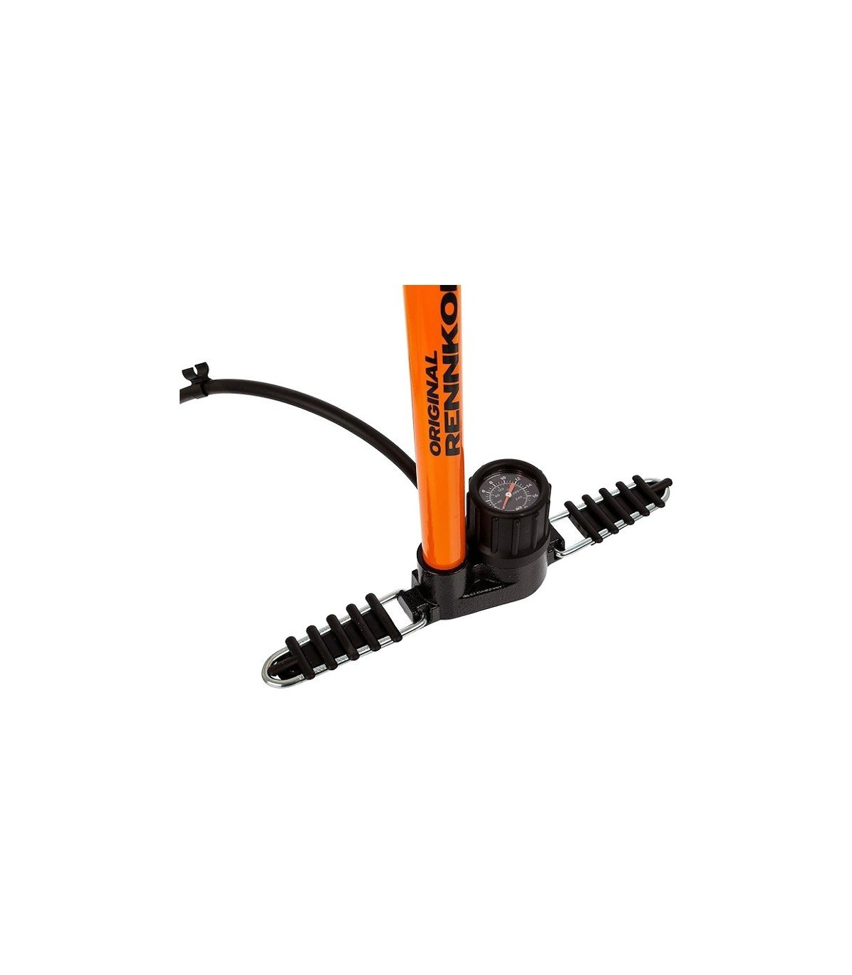 The RENNKOMPRESSOR has been the most popular pump in international cycling for more than 50 years and the sole legitimate ancestor of all bike stand pumps. The solid metal tube, cast iron base, precision pressure gauge and black wooden handle are proof of the best “made in Germany” quality. The feet fold up to make it easier to transport.