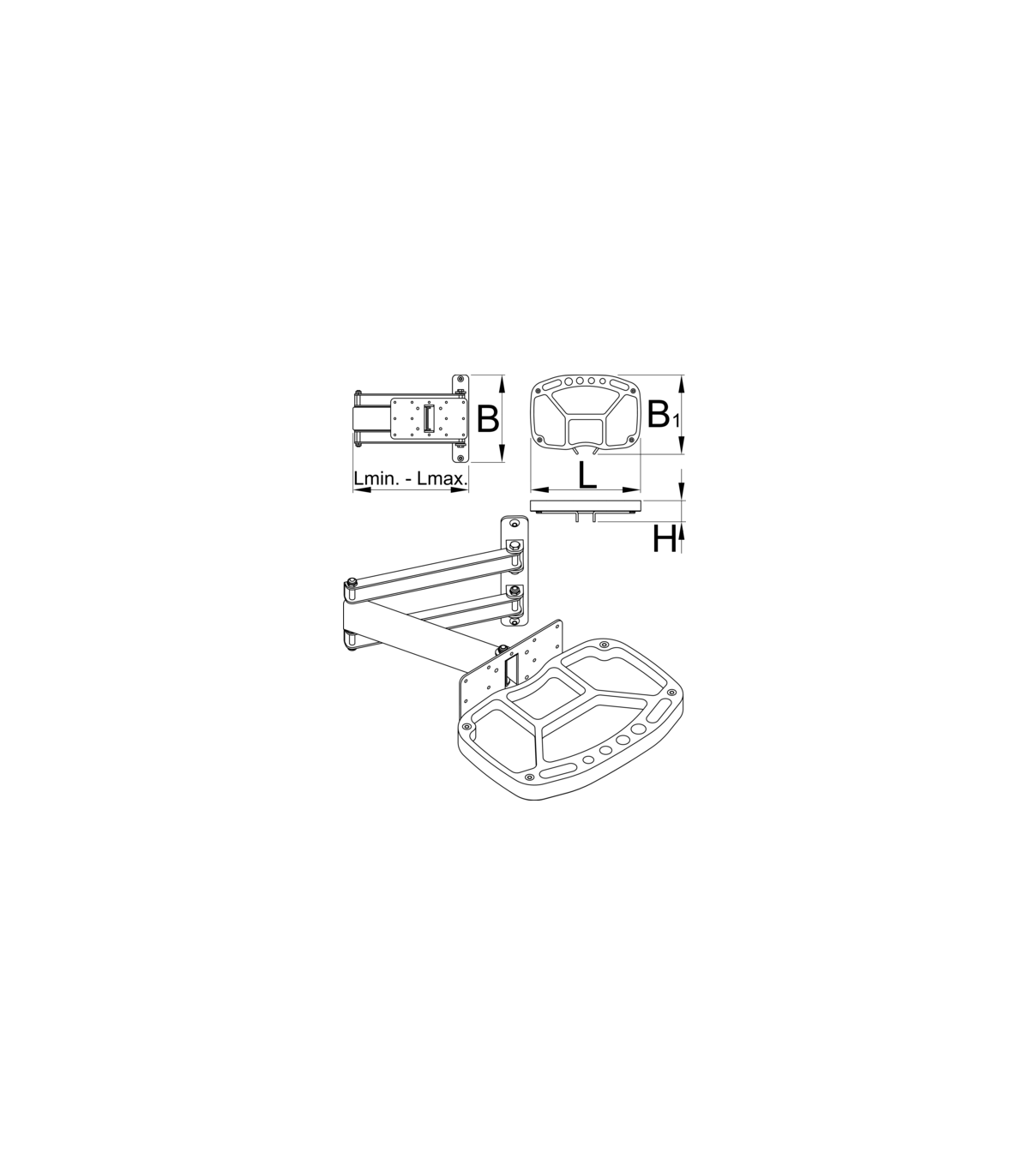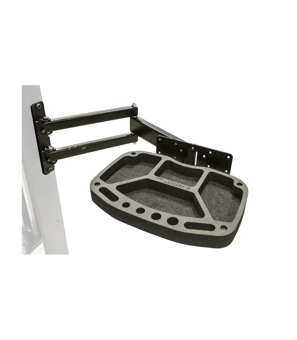 The foldable arm is 500 mm long and allows to pull the tool tray over the bike if needed or move it out of the work area when not in use.
