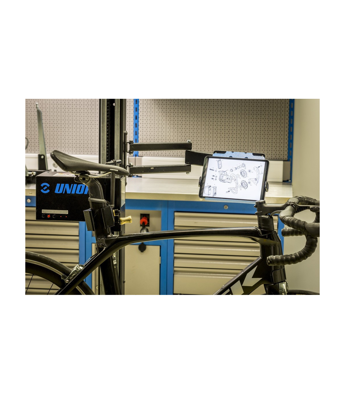 Foldable tablet holder mounts to the Unior’s electric repair stand column and provides optimal placement for the tablet.