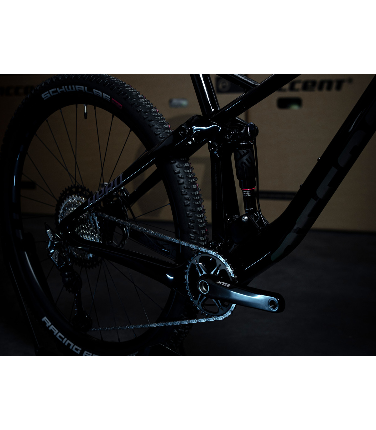 Napęd 1x12 Shimano XTR to gwarancja najwyższej klasy pracy i niezrównanej niezawodności. Uzupełniają go karbonowe koła Accent EVO Boost w standardzie 29”, które łączą niską wagę z wyjątkową sztywnością boczną.