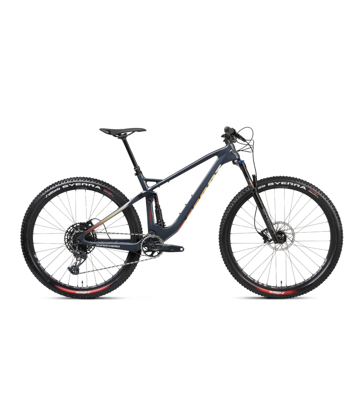 Geometria łączy cechy roweru XC i trail, dzięki czemu Super Hero jest szybki na podjazdach i pewny na zjazdach. Napęd SRAM GX Eagle 1x12 gwarantuje precyzję działania, a autorskie koła Accent EXE z obręczami tubeless ready i oponami Vittoria Syerra G2.0 zapewniają wysoką przyczepność i bezpieczeństwo.