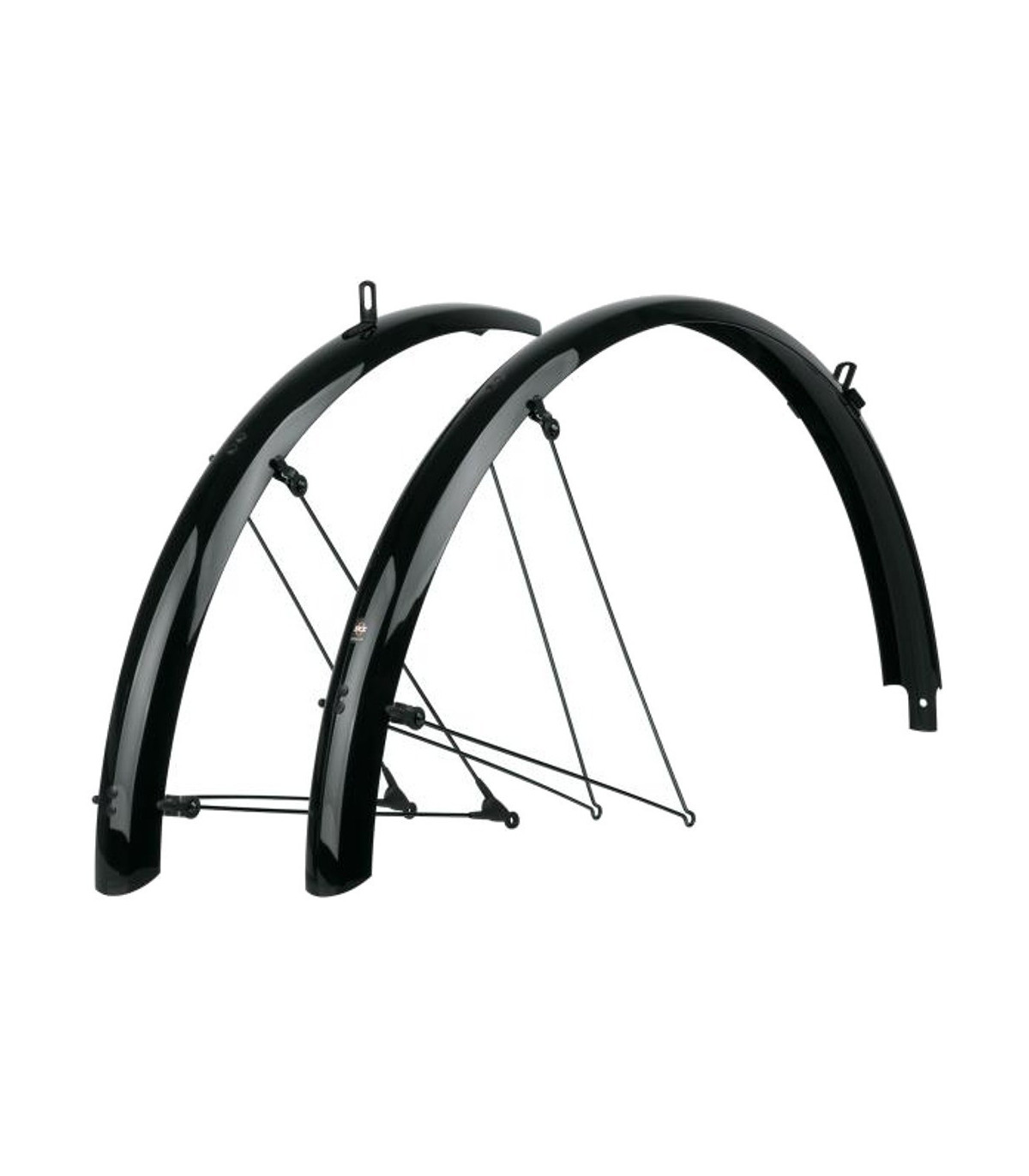 Komplet błotników Bluemels Basic produkowanych przez renomowaną niemiecką firmę SKS. Błotniki zostały wykonane z tworzywa sztucznego i zapewniają bardzo dobrą ochronę przed tryskającą spod kół wodą oraz błotem. Bluemels Basic posiadają opatentowany system ASR, który pozwala na ewentualne wypięcie wsporników błotnika, by uchronić go przed złamaniem w razie zablokowania gałęzi między szprychami. System ten pozwala również na bardzo szybki i prosty montaż.