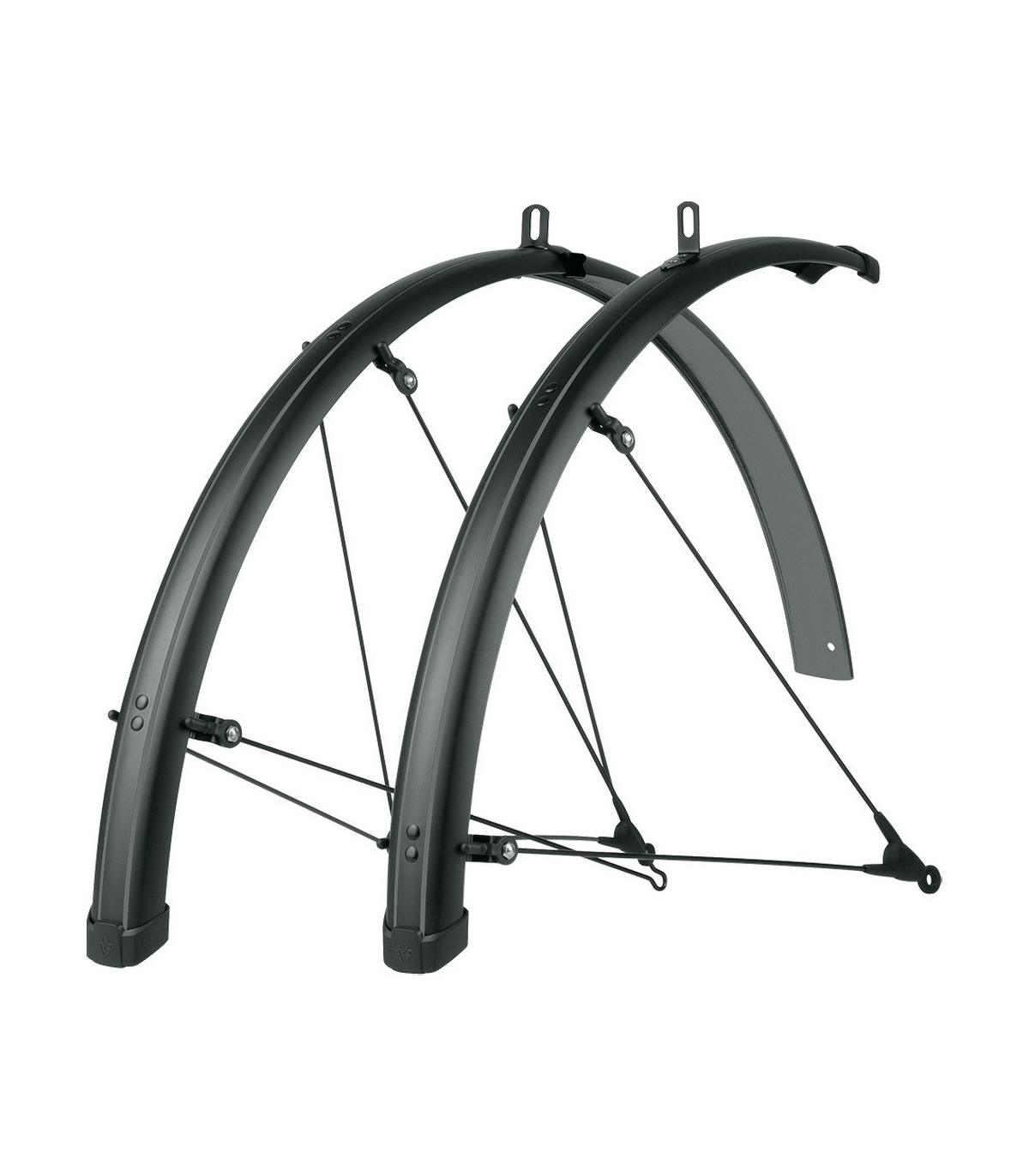 Komplet błotników Bluemels Stripes produkowanych przez renomowaną niemiecką firmę SKS. Błotniki zostały wykonane z tworzywa sztucznego i zapewniają bardzo dobrą ochronę przed tryskającą spod kół wodą oraz błotem. Bluemels Basic posiadają opatentowany system ASR, który pozwala na ewentualne wypięcie wsporników błotnika, by uchronić go przed złamaniem, w razie zablokowania gałęzi między szprychami. System ten pozwala również na bardzo szybki i prosty montaż.