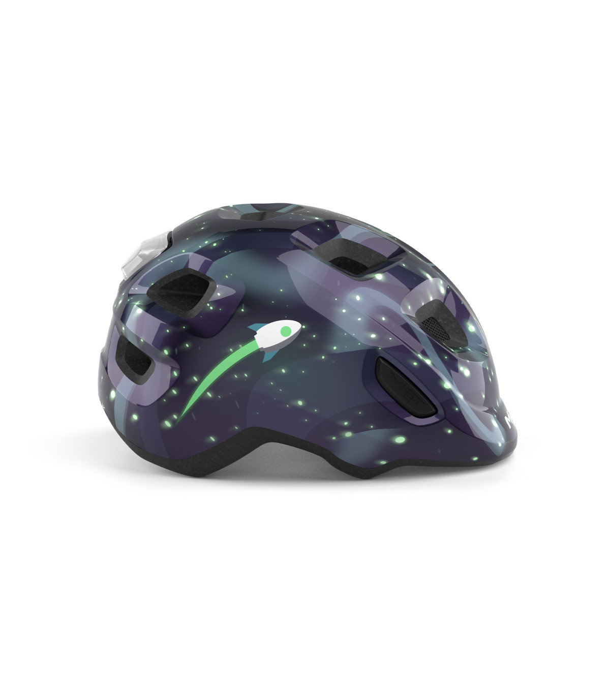 Wyjątkowe wykończenie space glow in the dark sprawia, że kask świeci w ciemności, poprawiając widoczność dziecka po zmroku i w słabszych warunkach oświetleniowych. Siatka przeciw owadom, klamra anti-pinch oraz tylna nalepka odblaskowa podnoszą bezpieczeństwo w codziennym użytkowaniu.