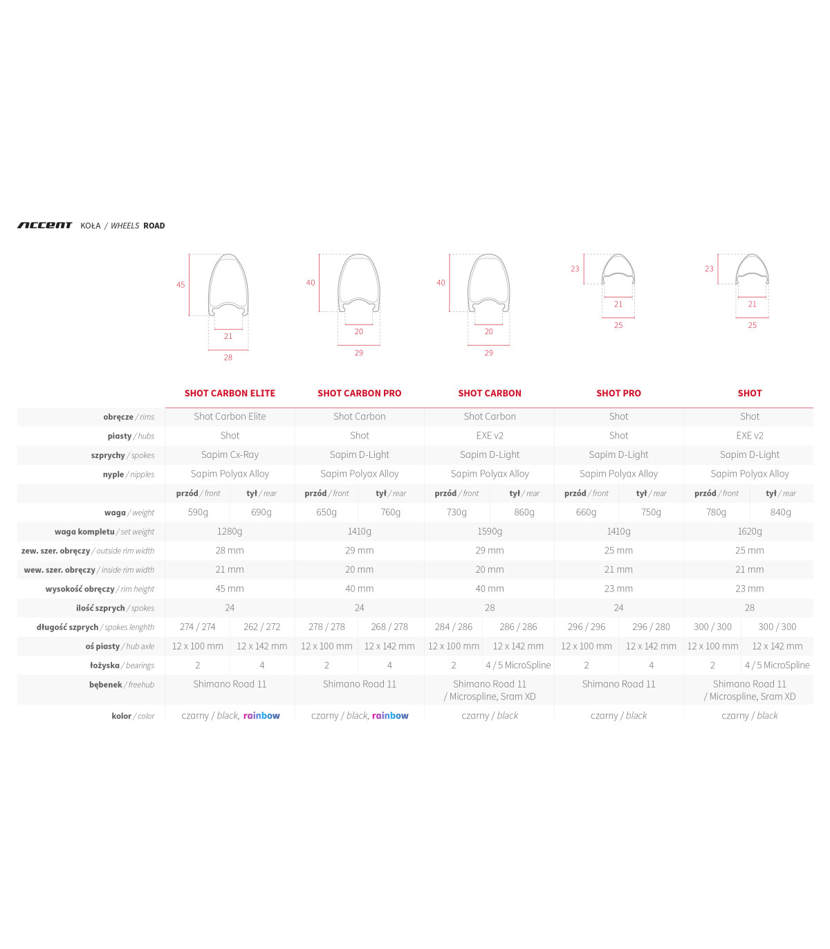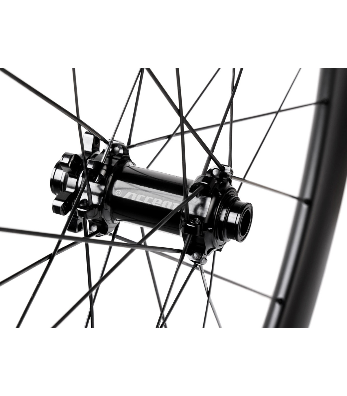 Topowe piasty Shot — jedne z najlżejszych w ofercie Accent (90/195 g), na łożyskach maszynowych, pod szprychy 24H straight pull.