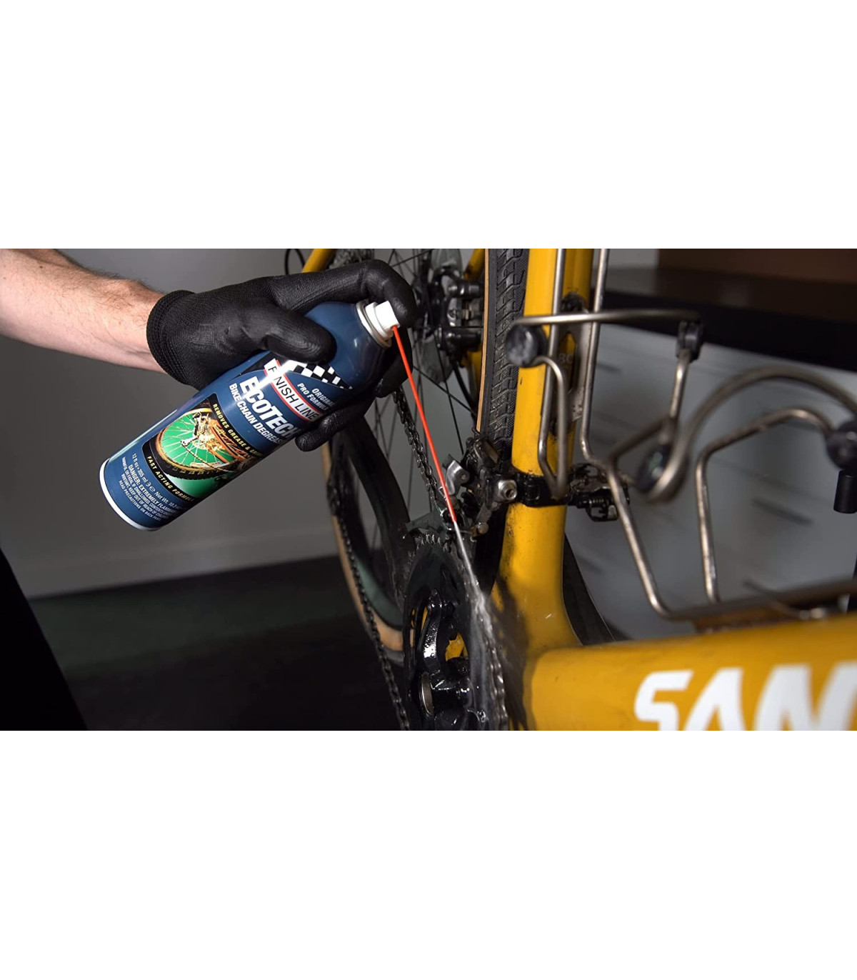 EcoTech Bike Degreaser zawiera w 100% aktywne (bez wody) biodegradowalne rozpuszczalniki odtłuszczające, dzięki czemu łańcuchy i przerzutki rowerowe są czyszczone szybciej i często bez konieczności spłukiwania wodą.