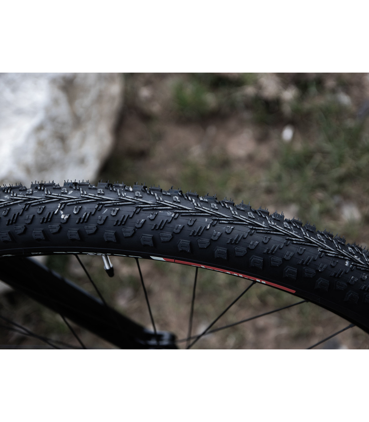Charakterystyczny układ klocków w kształcie litery V aktywnie „wgryza się” w luźny teren, skutecznie odprowadzając błoto i drobne zanieczyszczenia na boki. Dzięki temu opona zachowuje stabilność i trakcję nawet wtedy, gdy nawierzchnia przestaje być przewidywalna. Każdy klocek posiada nacięcia i wgłębienia, które poprawiają przyczepność na wilgotnym i błotnistym podłożu – bez utraty płynności toczenia.