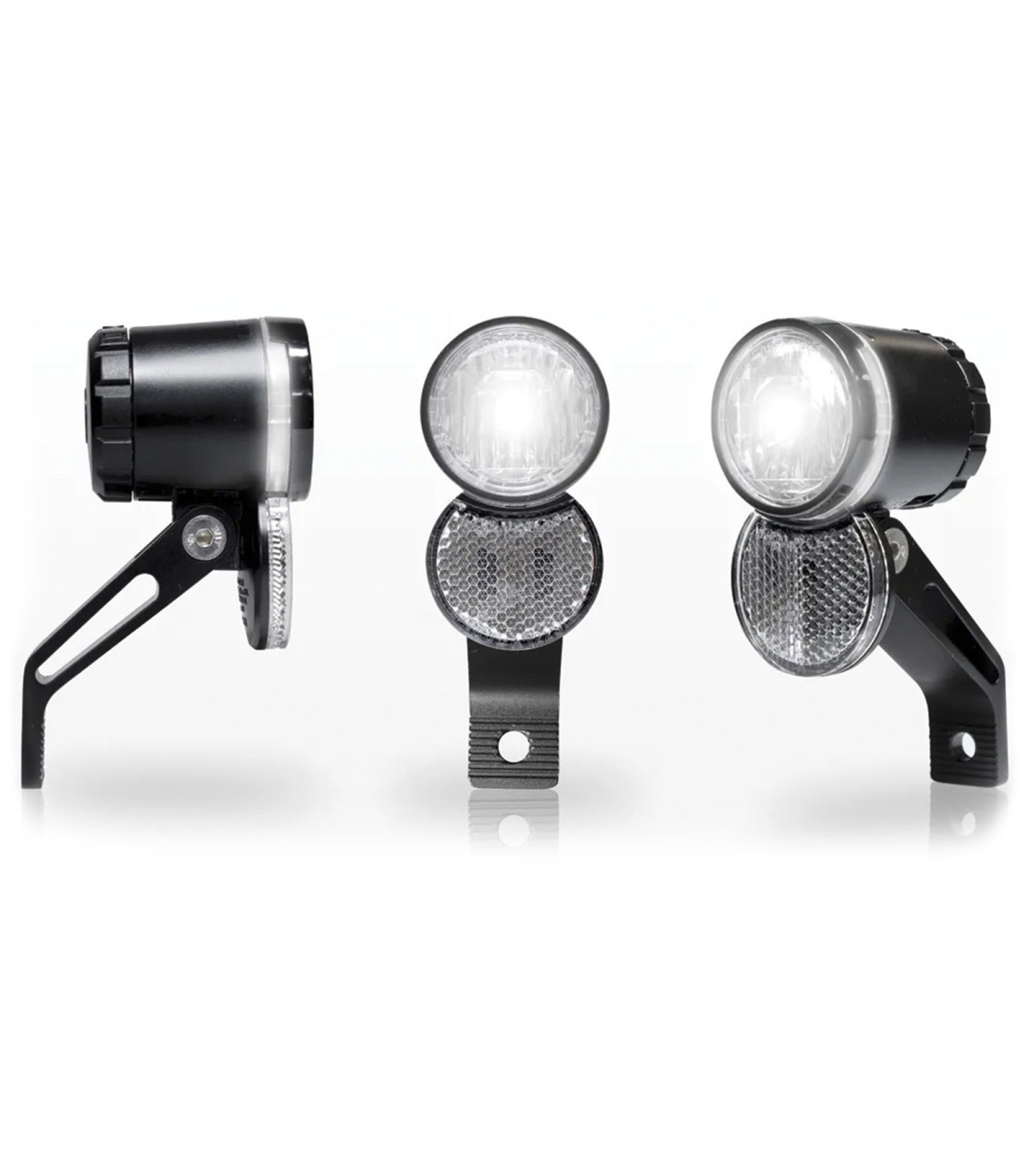 Model jest kompatybilny z systemami zasilania 6–12V stosowanymi w rowerach elektrycznych, a zintegrowany reflektor optymalizuje wiązkę światła i zwiększa efektywność oświetlenia. Montaż na widelcu zapewnia stabilne i estetyczne mocowanie.