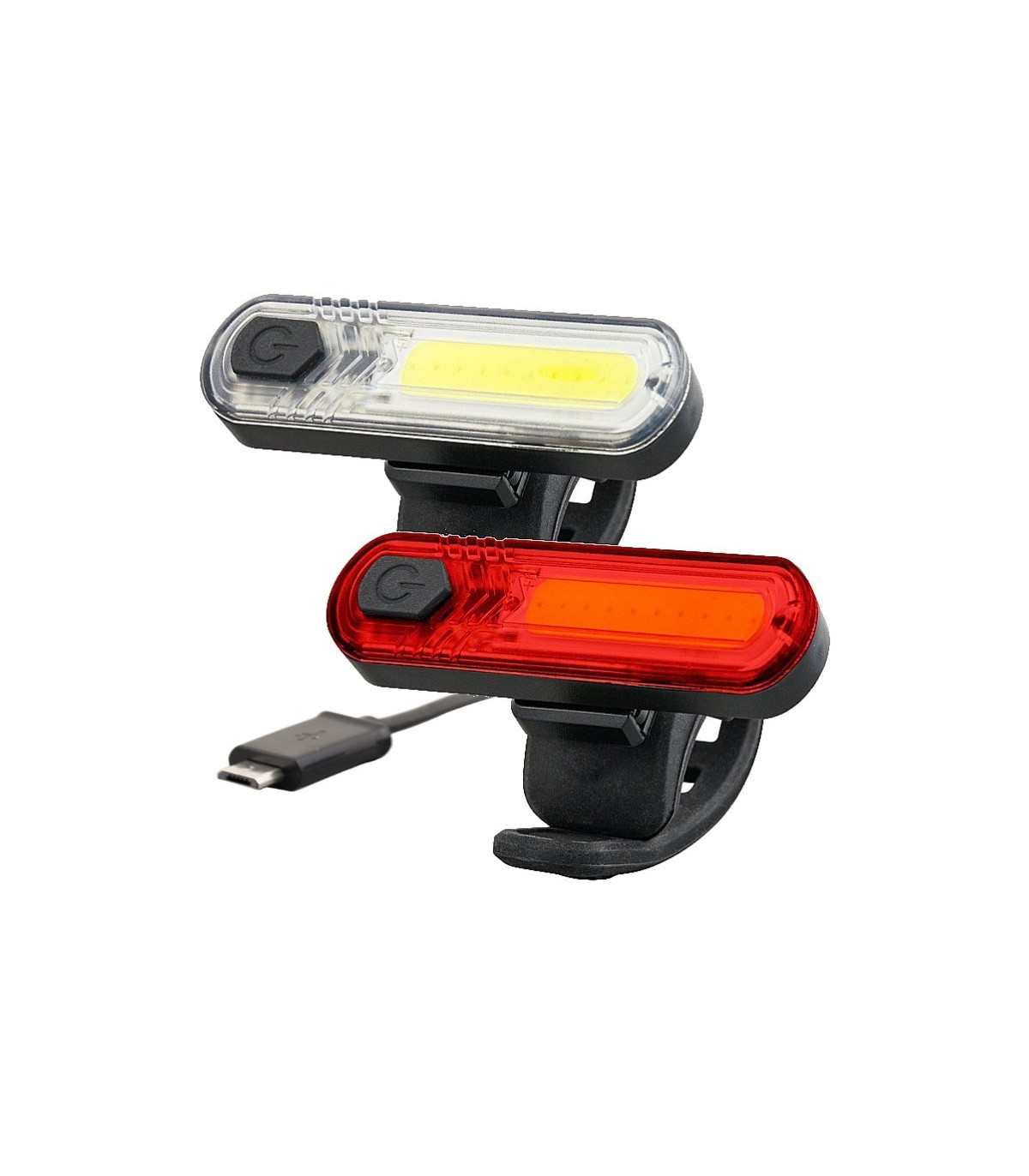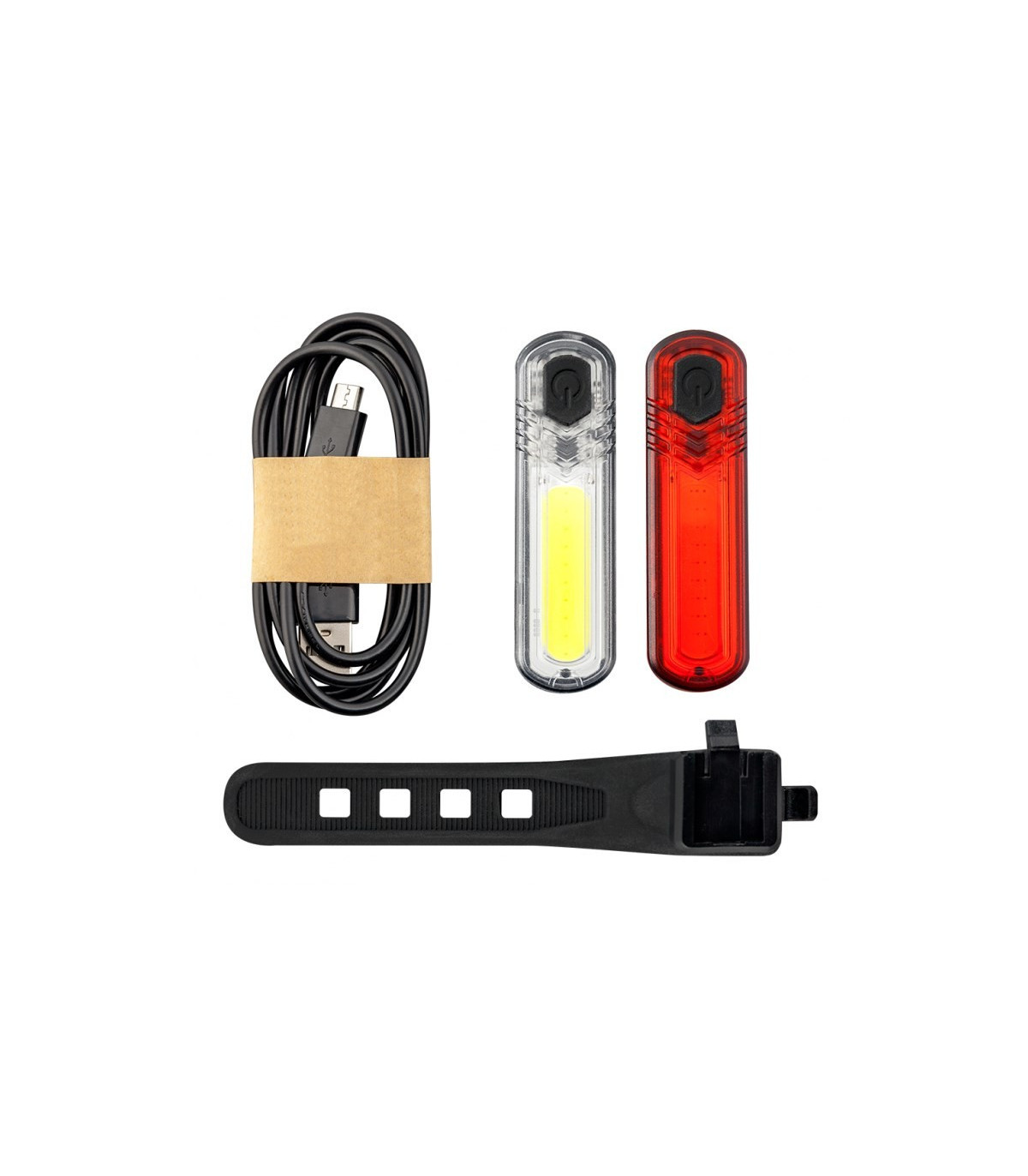 - Zestaw zawiera: Zestaw lamp DUOSLIM, Uchwyt na sztycę widelec dla każdej z lamp, Kabel MicroUSB
