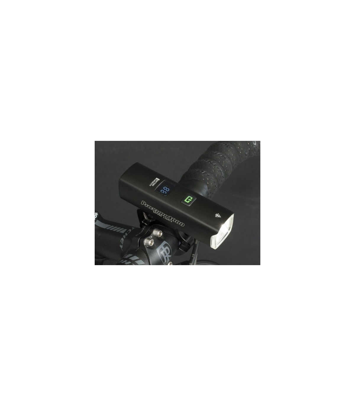 Wysokiej jakości lampka rowerowa w obudowie ze stopu aluminium o mocy 1000 lm z wbudowanym powerbankiem oraz wyświetlaczem LCD.