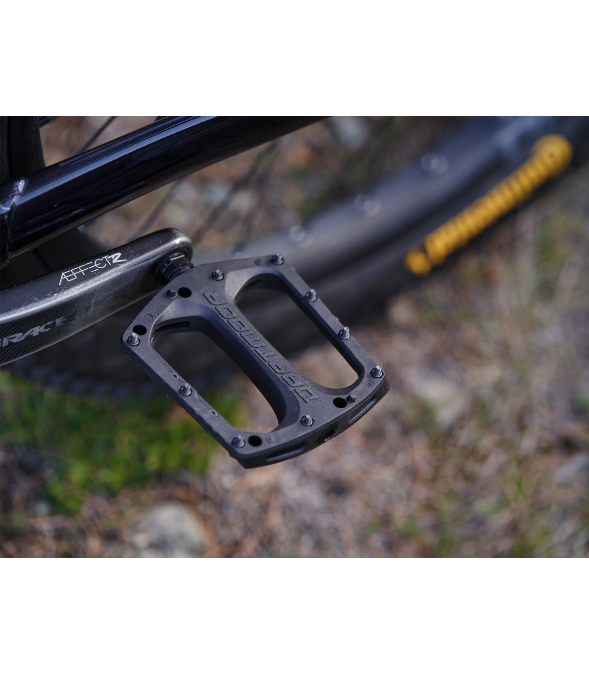 Drift to pedały zaprojektowane z myślą o jeździe bez kompromisów. Nylonowa platforma jest szeroka i niska, dzięki czemu daje naturalne, stabilne podparcie nawet pod bardzo szeroką podeszwę. Spłaszczona powierzchnia przy osi poprawia czucie roweru, a 9 stalowych pinów na każdej stronie gwarantuje przyczepność w każdych warunkach — na sucho, w błocie i podczas lądowań.