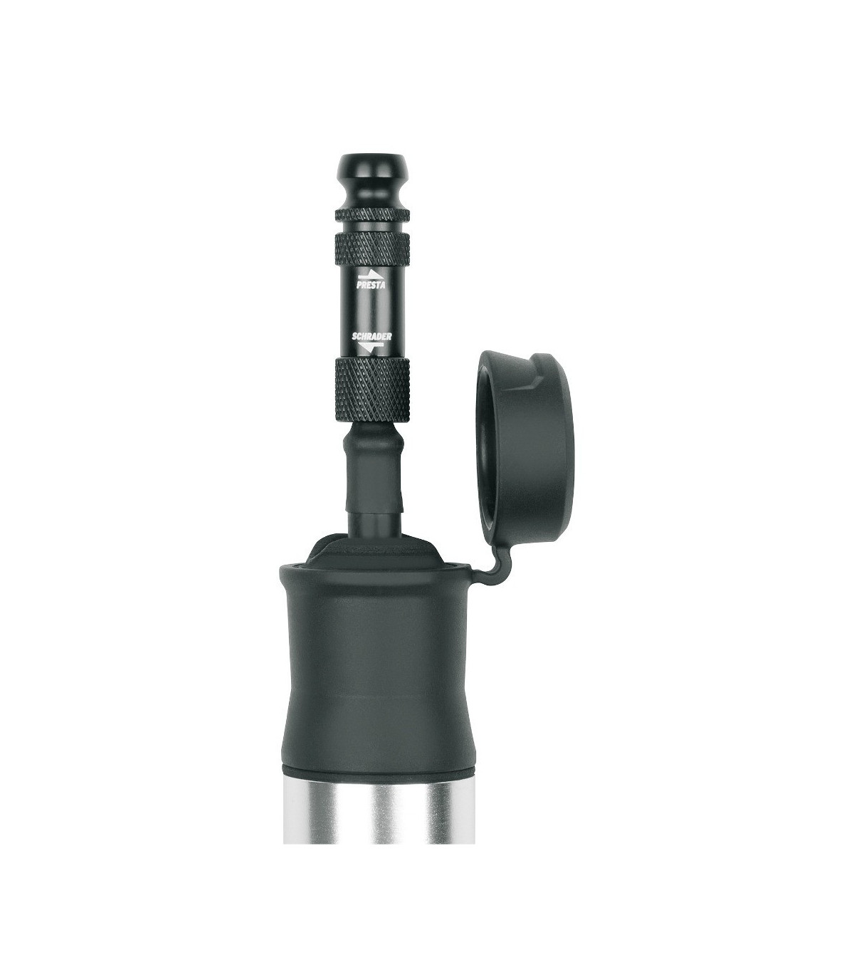 Wąż przechowywany wewnątrz pompki, zakryty zaślepką, przykręca się do głowicy zaworu z całkowicie szczelnym połączeniem z wentylami AV / SV. Pompka zapewnia ciśnienie do 5 barów / 73 PSI.